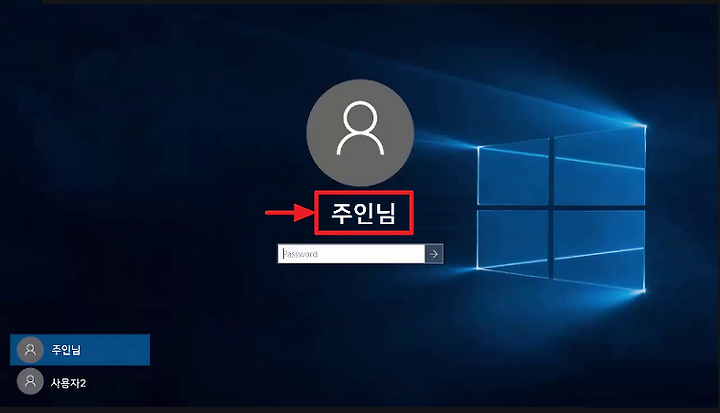 부팅시 사용자가 2명이라면 사용자를 선택한후 패스워드 설정이 되었다면 입력후 로그인할수 있습니다.